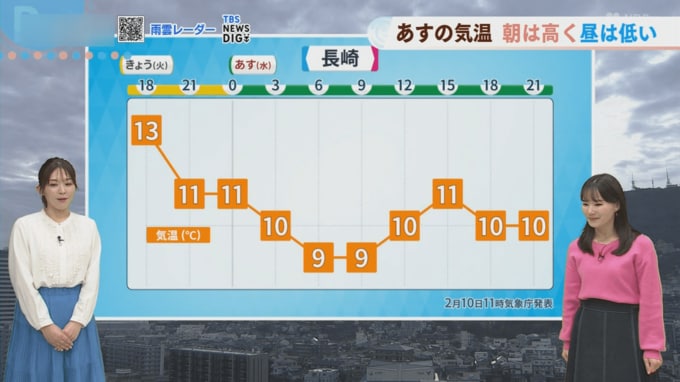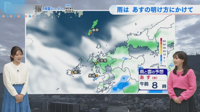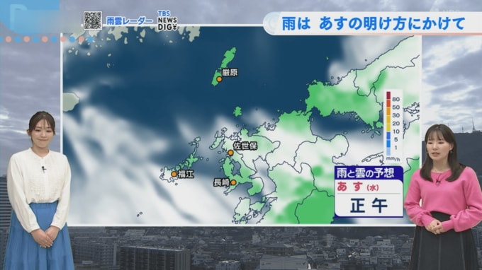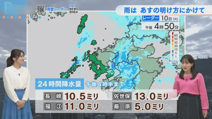 10日(火)は午後4時半までの降水量が、長崎で10.5ミリ、佐世保で13.0ミリ、福江で11.0ミリとなりました。気象予報士の平地さんによると「12月下旬に県内広い範囲で10ミリほど降って以来のまとまった雨」となり、季節感としても「冬の降り方ではなく、ちょっと春を感じる降り方」だったといいます。雨雲の予想では、あす11日(水)の明け方にかけてところどころ雨雲が予想されています。あす11日(水)の朝8時頃にはその雨雲が抜けていく予想ですが、「朝は弱いシトシトとした雨が降っているかもしれません」とのことです。