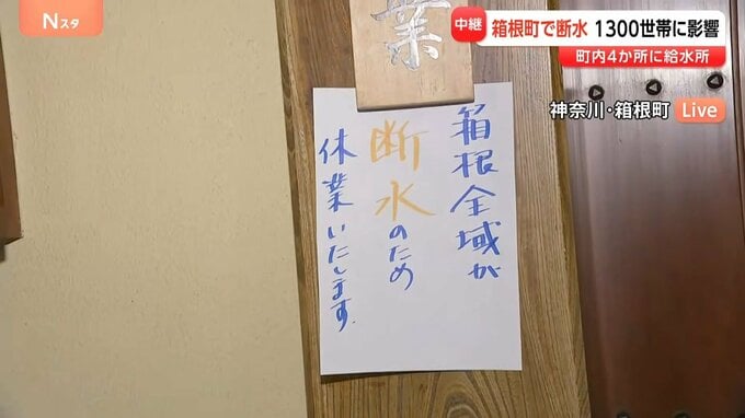 温泉宿が集まる湯本地区や塔ノ沢地区などでおよそ1300世帯に影響が出ていて、箱根湯本駅前の一部の飲食店は休業しています。温泉宿やホテルなどへの影響は把握できていないということで、箱根町は水道管の復旧工事を行い、対応にあたっています。
