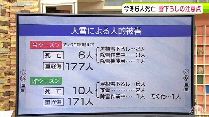 同じく“豪雪”だった昨シーズンの死者は10人、このうち屋根の雪下ろしでの死者は6人となっています。