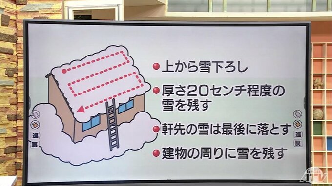 落ちてきた雪に巻き込まれないように、上から雪下ろしをすること。また、滑りにくくするため厚さ20cm程度の雪を残して作業すること。軒先の雪は、作業の最後に落とすことなどを心がけるようにして下さい。