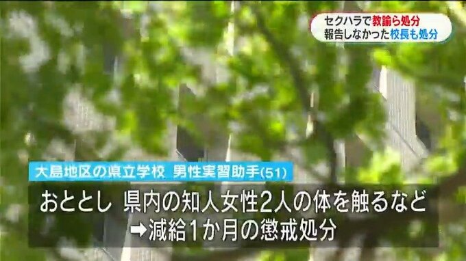 また、大島地区の県立学校に勤務する男性実習助手(51)は、おととし、県内の知人女性2人に対し、体を触ったり性的な発言をしたりしたとして、減給1か月の懲戒処分となりました。男性は「冗談のつもりで、自分の認識が甘かった」と話しているということです。
