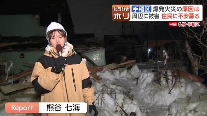 何もない場所には、9日早朝まで、家族3人が暮らす住宅がありました。その家が爆発して、その住宅の木片が、隣の家の壁に突き刺さって、穴が開いたり、窓ガラスが飛び散っている状況です。隣の住宅の人に許可をもらって撮影していますが、地面には、まだ木片だったり、ガラス片が飛び散っていて、散乱している状況です。そして、一番現場で驚いたのが、こちら風除室の扉ですが、ガラスがすべて爆風で飛び散ってしまっていて、窓枠だけが取り残されている状況です。近隣の住民の方々にお話を伺いましたが、一番皆さん心配されているのが、今、室内にガスが漏れているかどうかが、一番心配だというふうに話していらっしゃいました。ガスはもう開始されているんですけれども、この寒い中、ブルーシートで住宅を覆われている方も多い中、皆さん、ガスを自ら止めて、灯油ストーブなどで生活しているというふうに話していらっしゃいました。ですので、爆発した原因の早い究明が待たれます。