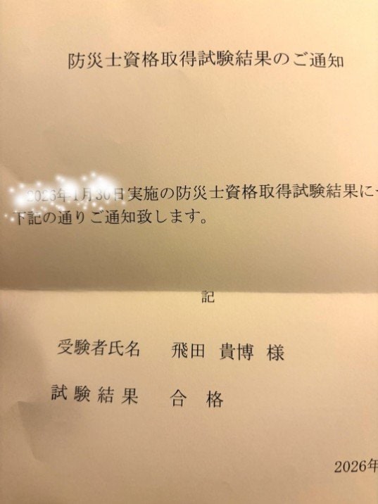 ブログには「合格通知!」と記された上で、結果通知書の画像の投稿も。そこには「受験者氏名 飛田貴博」と東さんの本名が記載され、その下には「試験結果 合格」と書かれています。
