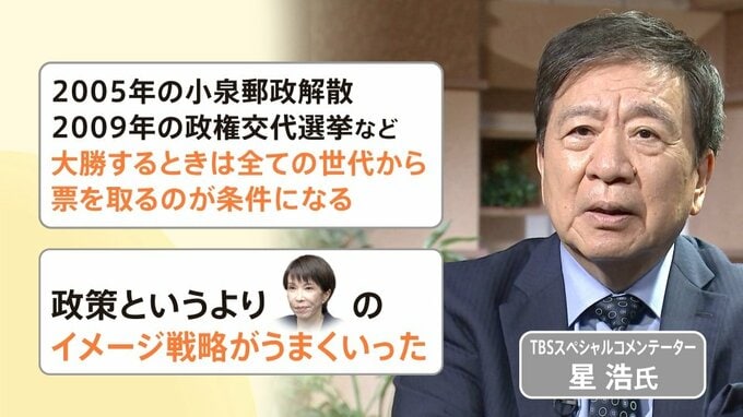 TBSスペシャルコメンテーターの星浩さんは「2005年の小泉郵政解散、2009年の政権交代選挙など、大勝するときは全ての世代から票を取るのが条件になる。政策というより、高市総理のイメージ戦略がうまくいった」と分析します。