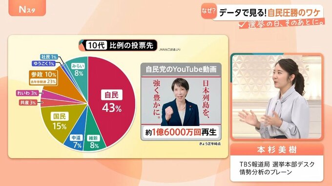 10代の43%が自民党に投票しています。1票入れるときの基準は、世代によって違うと思いますが、どの世代でも約4割の票を得たということは、バランス良く高市総理のメッセージが全員に伝わったということではないでしょうか。