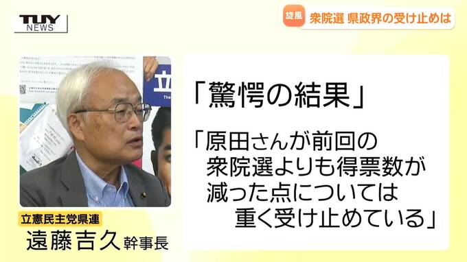 一方、中道改革連合を結成しての選挙戦となった立憲民主党県連の遠藤吉久幹事長は、「驚愕の結果。原田さんが前回の衆院選よりも得票数が減った点については、重く受け止めている」とコメントしています。