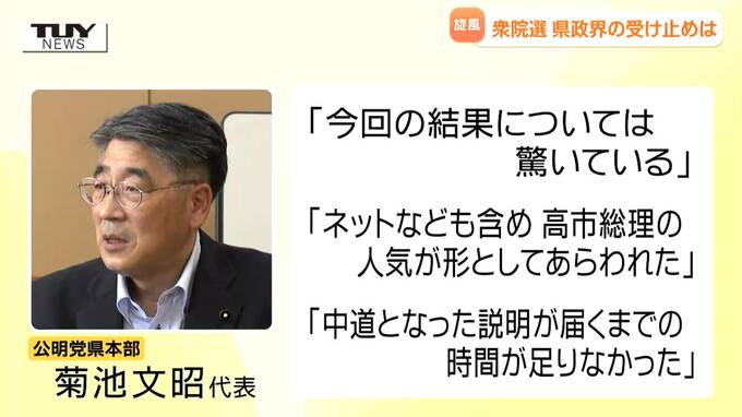 同じく中道改革連合として選挙戦を戦った公明党県本部の菊池文昭代表は、「今回の結果については驚いている。ネットなども含め、高市総理の人気が形として表れた。中道となった説明が届くまでの時間が足りなかった」と敗因を分析しています。