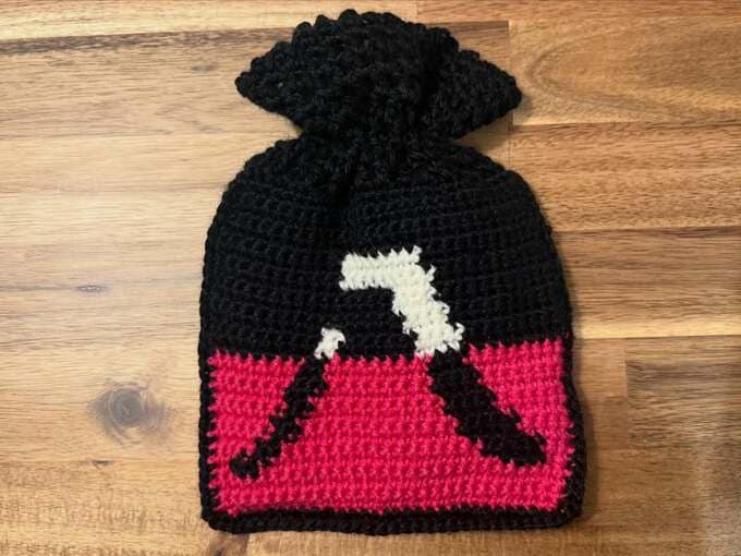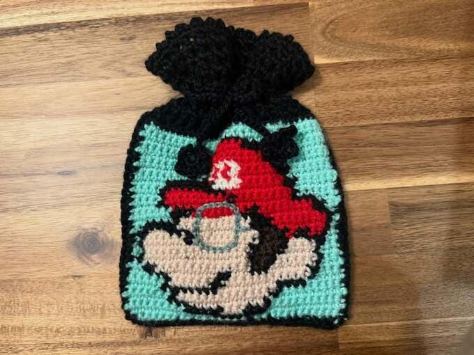 八嶋さんが手にしているポーチには、赤い帽子をかぶったキャラクターが編み込まれていますが、その目のあたりにはメガネの枠が描かれているようです。小芝さんは「八嶋さん要素を入れるために、マリオの帽子の『M』の部分を『八』に変えたり、メガネをかけさせてみたり」と、まさに〝ヤシマリオ〟とも呼べる工夫を凝らした模様。