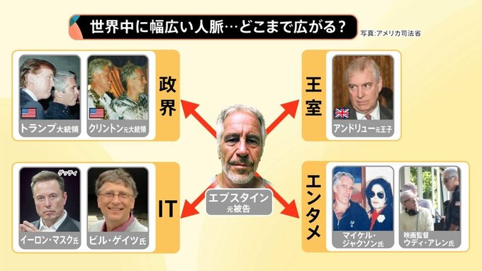 交友関係が指摘されているのは、▼トランプ大統領やクリントン元大統領といった「政界」。▼「イギリス王室」のアンドリュー元王子(チャールズ国王の弟)、▼「IT業界」では、イーロン・マスク氏やビル・ゲイツ氏など。