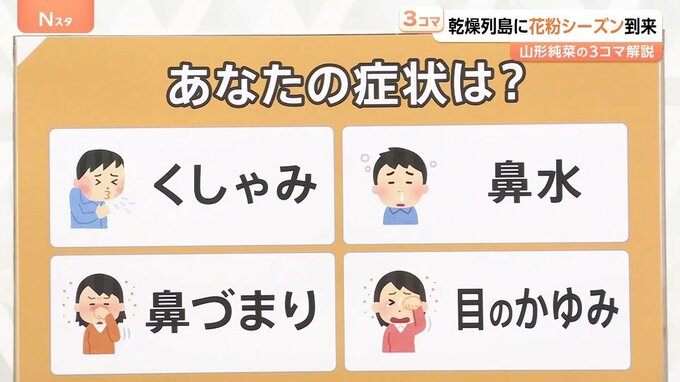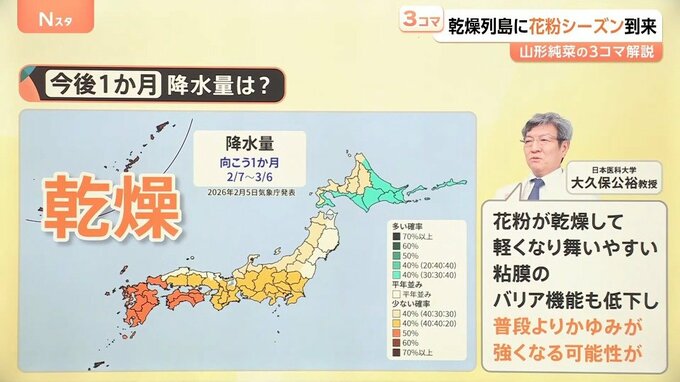 太平洋側を中心に空気が乾燥している状態が続いているということで、花粉症治療の第一人者である日本医科大学・大久保公裕教授は「花粉が乾燥して軽くなり舞いやすい。粘膜のバリア機能も低下し、普段よりかゆみが強くなる可能性がある」と分析します。