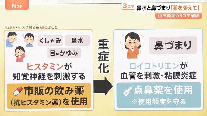 大久保教授によると▼くしゃみ、▼鼻水、▼目のかゆみはヒスタミンが知覚神経を刺激するため、▼市販の飲み薬(抗ヒスタミン薬)を使用するといいということです。