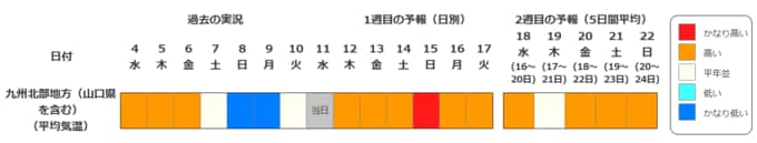 九州北部地方(山口県を含む)の向こう2週間の気温は、寒気の影響を受けにくいため高い日が多く、15日頃からはかなり高くなる可能性があります。