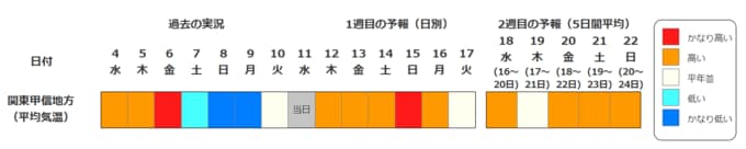 関東甲信地方の向こう2週間の気温は、寒気の影響を受けにくく暖かい空気が流れ込みやすい時期があるため高く、15日頃からはかなり高くなる見込みです。