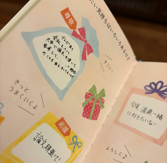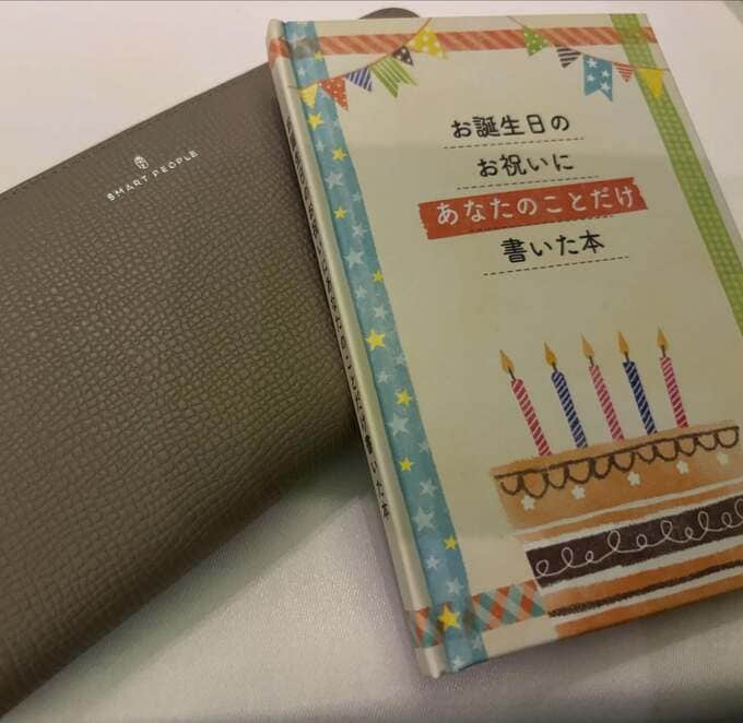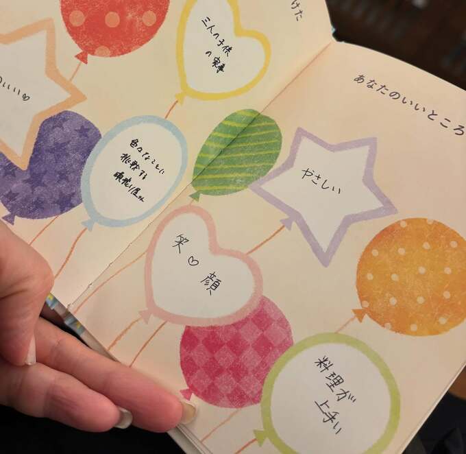 プレゼントは「お誕生日のお祝いにあなたのことだけ書いた本」というタイトルで、表紙にはバースデーケーキと旗のイラストが描かれています。中ページには星形やハート形の風船が連なり、「色々なことに挑戦する頑張り屋さん」「やさしい」「笑♡顔」「料理が上手い」などの言葉が添えられていました。