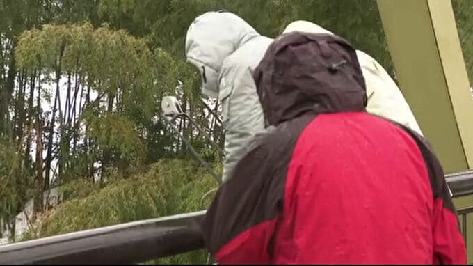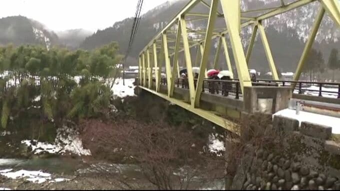 一夜明けた11日午前11時前から、石川県の職員が取水口のおよそ200m上流にある橋で、およそ7ℓの水を川からくみ上げ、検査用の容器に移しました。