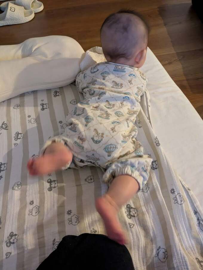 翔子さんは「ずり這いがはじまり」「寝返りコロンコロンするから」「ぶつけないか心配」と、硬い床での双子たちを心配。