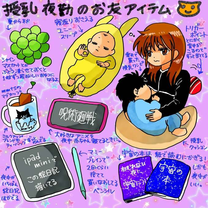 そして「夜中ミルクなかなか飲んでくれないで格闘してるとき」「大好きな呪術廻戦をみるのがしあわせです」「大好きなアニメを夜中赤ちゃんが寝てるときに」と、合間での一息に楽しむエンタメについてもシェアしています。