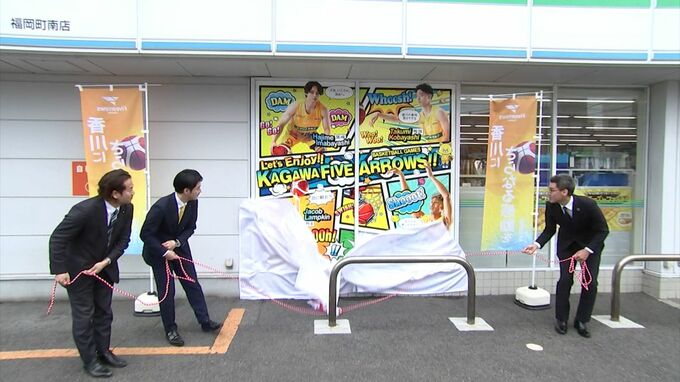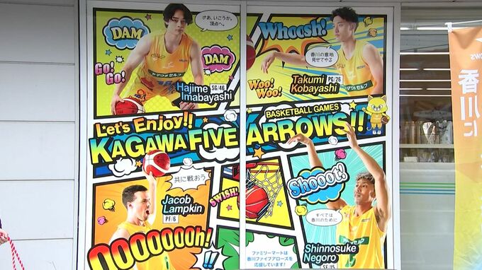 バスケットボールB3リーグ香川ファイブアローズを応援しようと、選手の写真でラッピングしたコンビニエンスストアが高松市に登場しました。