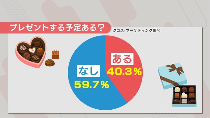 調査会社クロス・マーケティングの調べによりますと、「今年のバレンタインデーにプレゼントを贈る予定があるか?」という質問の回答は、「ある」40.3%、「ない」59.7%でした。
