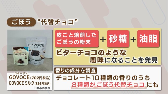 ゴボウ茶を販売する企業が、皮ごと焙煎したゴボウの粉末に砂糖や油脂を混ぜたところ、ビターチョコレートのような風味になることを発見したそうです。