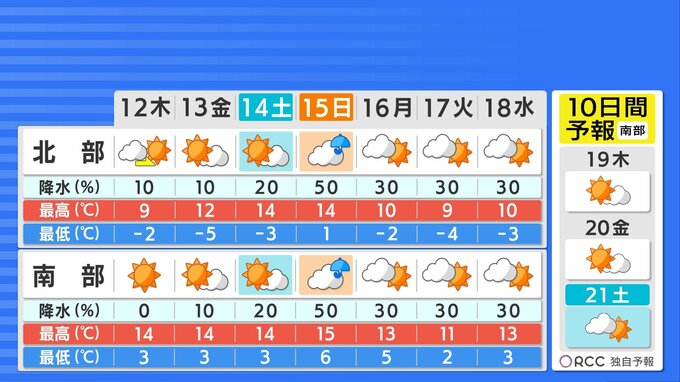 土曜日にかけておおむね晴れるでしょう。日曜日は気圧の谷が通過しすっきりしない見込みです。日中の気温は上昇し、週末にかけて再び春の陽気になります。一日の寒暖差・日ごとの寒暖差がかなり大きいですので体調管理にはくれぐれもご注意ください。また、雨が降った後気温が上昇すると、なだれが発生しやすくなります。雪が多かった地域では、屋根からの落雪やなだれに注意してください。