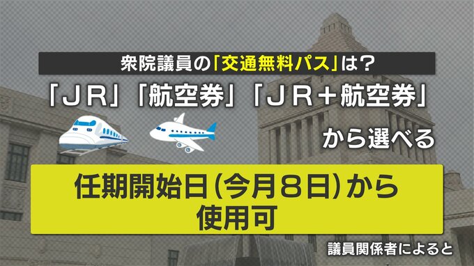 議員関係者によりますと、JRか航空券、もしくはその両方から選べて、この権利も「任期開始日(2月8日)」から使えるそうです。