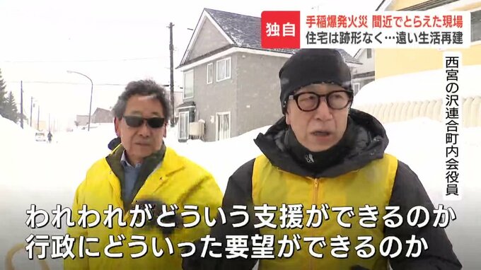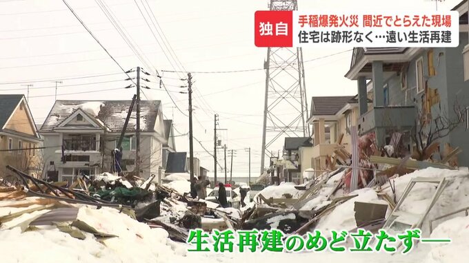 道路を挟んだ向いの住宅にまで建物の破片が飛び散り、隣の住宅では、焼け残った骨組みがむき出しとなっていました。
