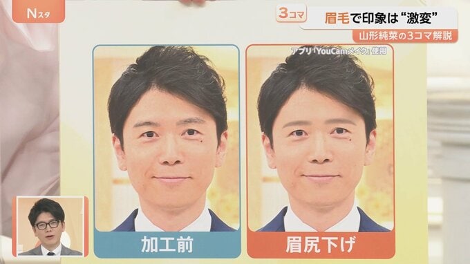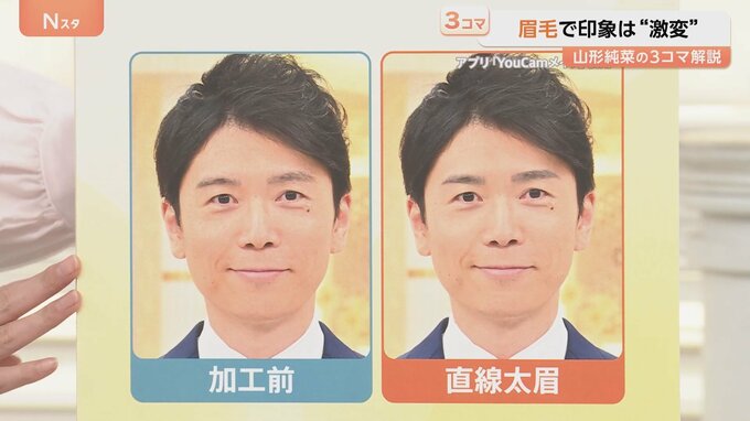 写真加工アプリで井上キャスターの眉毛を『直線太眉』に変えてみると、意思が強そうな感じに。また、『眉間を少し狭く、上がり眉』に変えてみると、より強い印象になります。