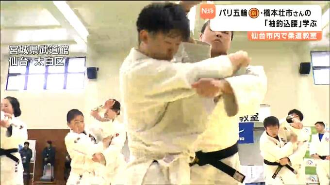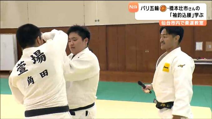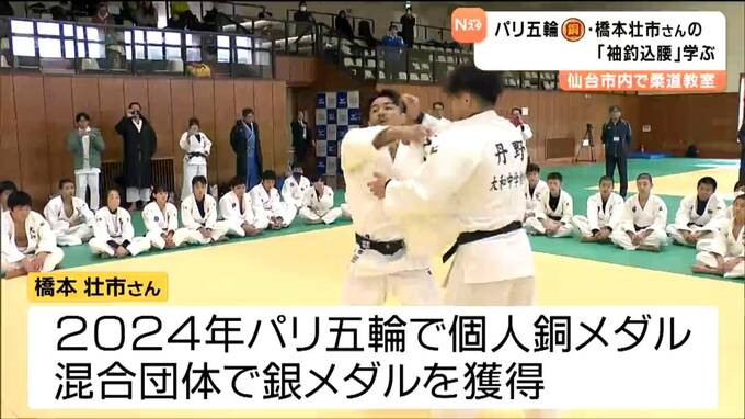 パリオリンピックのメダリスト・橋本壮市(はしもと・そういち)さんによる柔道教室が仙台で開かれ参加した中学生が橋本さんが世界で活躍する原動力となった得意技「袖釣込腰(そでつりこみごし)」の技術などを学びました。