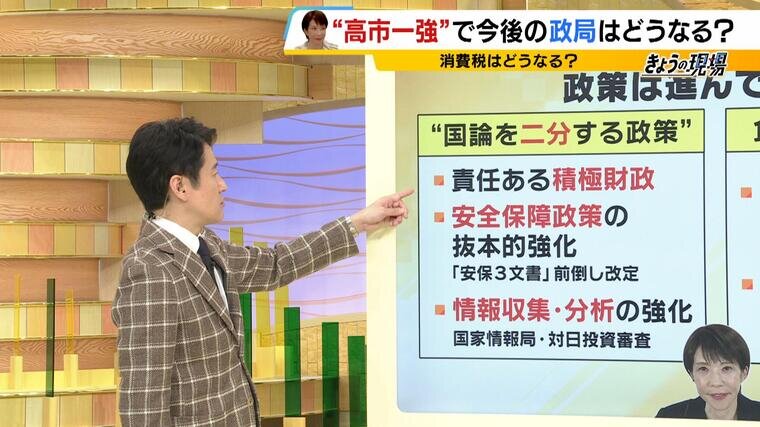 国家情報局の設置や対日投資審査、安保3文書の前倒し改定などについて、今野氏は「官邸の方から聞こえてくる話では、高市総理はこれらを全部やりたいと言っている。今は支持率も高いので、優先順位は高め」と指摘し、一気に進める構えであるとの見方を示しました。
