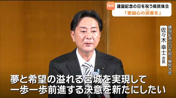 建国記念の日を祝う県民大会・佐々木幸士会長:「私たちは故郷を愛する心を一つにし、夢と希望の溢れる宮城を実現して一歩一歩前進する決意を新たにしたい」