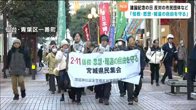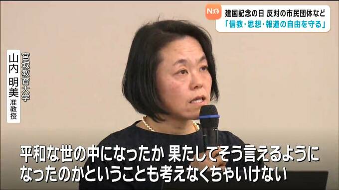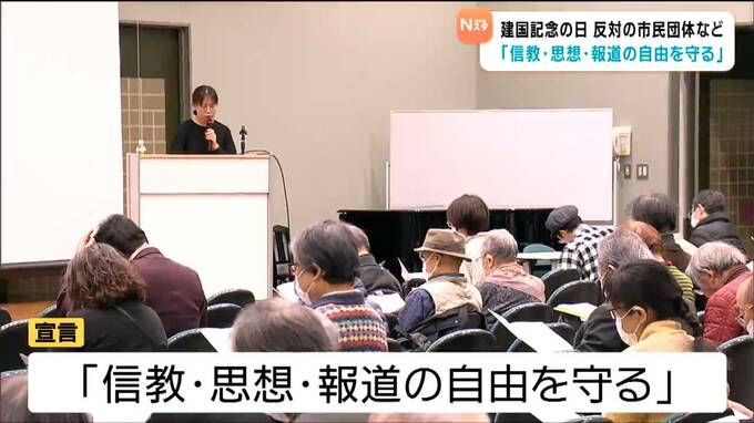 集会では「建国記念の日」に歴史的な根拠はなく5月3日の「憲法記念日」が現在の日本の誕生を祝うのにふさわしいと訴えたほか「信教・思想・報道の自由を守る」と宣言しました。