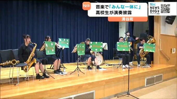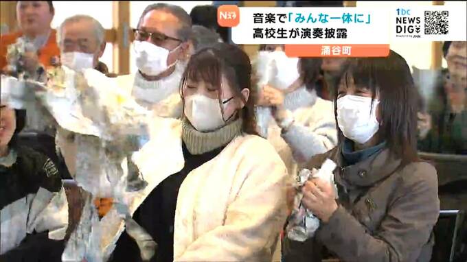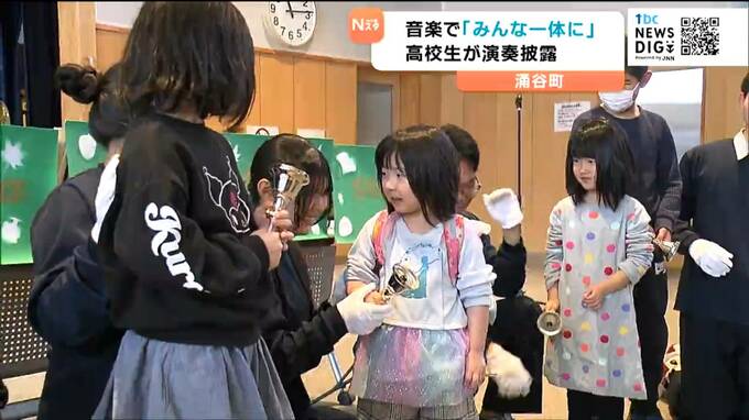 涌谷町で11日、音楽に親しむワークショップが開かれ訪れた親子らが高校生による演奏を楽しみました。