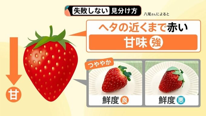 「失敗しない見分け方」は、八尾さんによると、▼ヘタの近くまで赤いものは甘味が強いそうです。また、▼ヘタは反り返っていて、緑の発色もいいものが採ってから間もない新鮮である証拠だそうです。