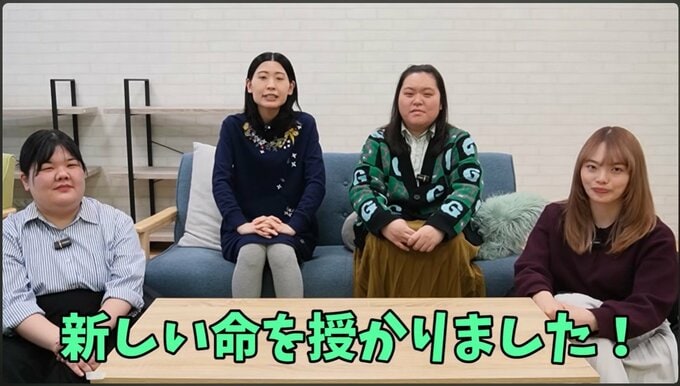 「さあ、ぼる塾チャンネル始まりましたけれども、なんとうちの坂上さんから皆様にご報告がございます」と動画が始まり、酒寄さんが「えー、私、酒寄希望、新しい命を授かりました」と発表しました。