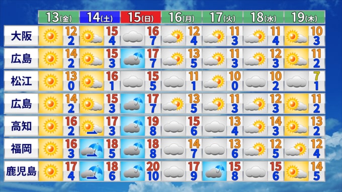 全国の週間予報 週末は最高気温15℃超も