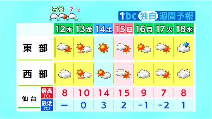 気温は土日にかけて大きく上がり、土曜日と日曜日の日中は4月上旬から中旬並みの陽気となります。春本番のような気温となり、山沿いではなだれの発生に注意が必要です。