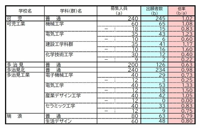 東濃・飛騨エリア(多治見・恵那など)の各校出願状況・倍率