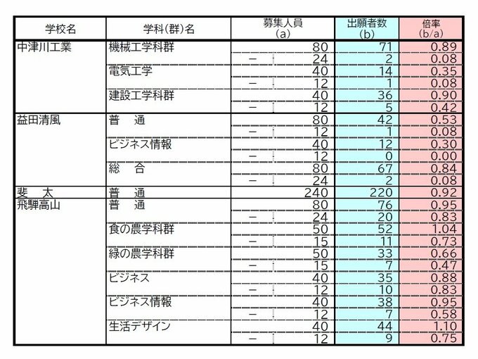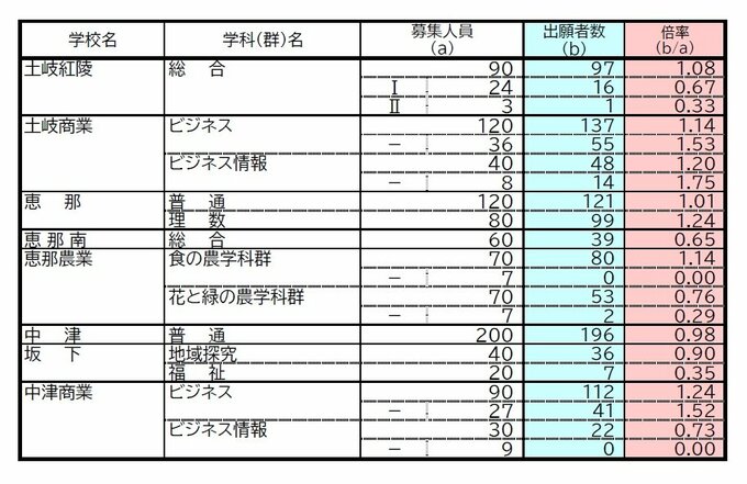 【岐阜県公立高校入試2026】出願状況 第一次・連携型選抜・通信制前期選抜の志願倍率 出願状況 岐阜1.16倍 大垣北1.19倍 岐阜北1.21倍 加納1.34倍 全校掲載・一覧(令和8年度) 4時間前