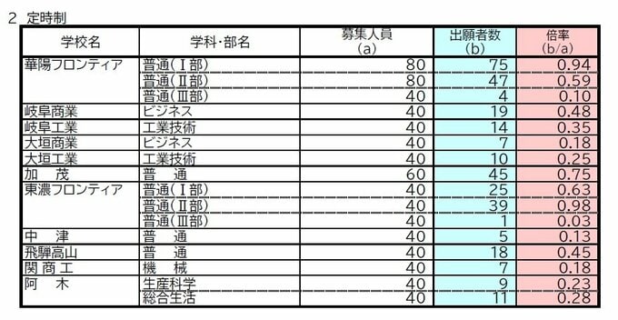 【岐阜県公立高校入試2026】出願状況 第一次・連携型選抜・通信制前期選抜の志願倍率 出願状況 岐阜1.16倍 大垣北1.19倍 岐阜北1.21倍 加納1.34倍 全校掲載・一覧(令和8年度) 5時間前
