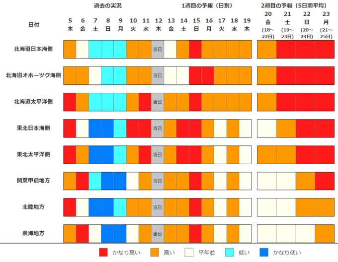 北日本と東日本の向こう2週間の気温は、寒気の影響が弱いため平年並か高く、15日頃と19日頃からはかなり高い所もあるでしょう。農作物の管理等に注意してください。西日本と沖縄・奄美の向こう2週間の気温は、平年並か高いでしょう。