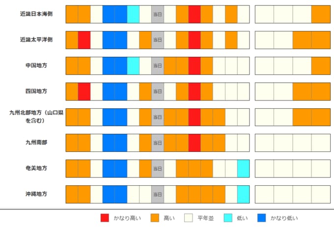 ・2週目の予報は中心の日に前後2日間を加えた5日間の平均(平均気温の5日間平均)です。平均期間は中心の日の下に表示しています。2週目のかなり高い(かなり低い)は、かなり高い(かなり低い)気温となる確率が30%以上のときに表示します。