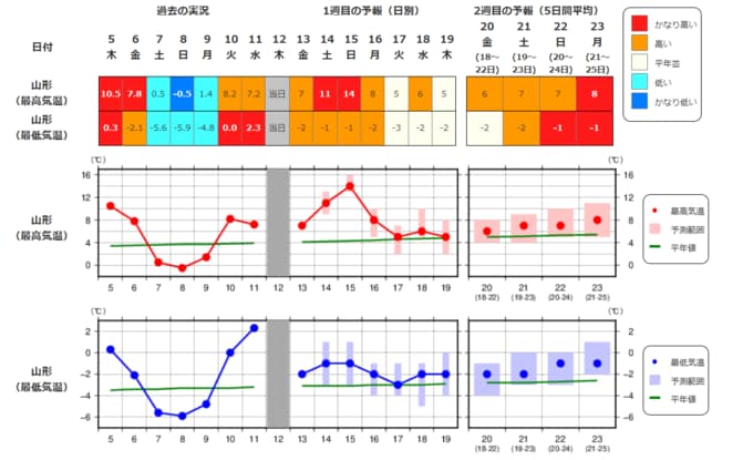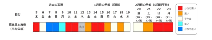 ・2週目の予報は中心の日に前後2日間を加えた5日間の平均(最高気温の5日間平均、最低気温の5日間平均、平均気温の5日間平均)です。平均期間を中心の日の下に表示しています。2週目のかなり高い(かなり低い)は、かなり高い(かなり低い)気温となる確率が30%以上のときに表示します。