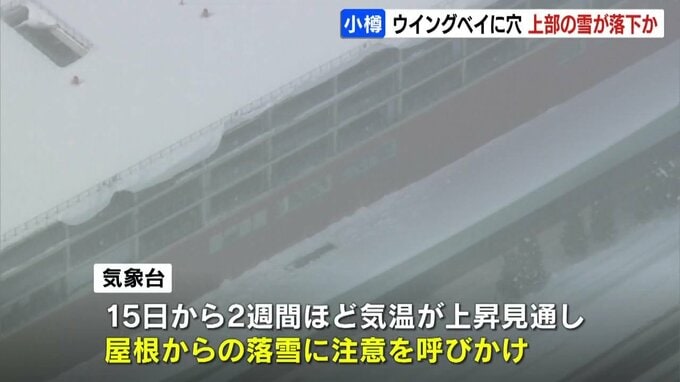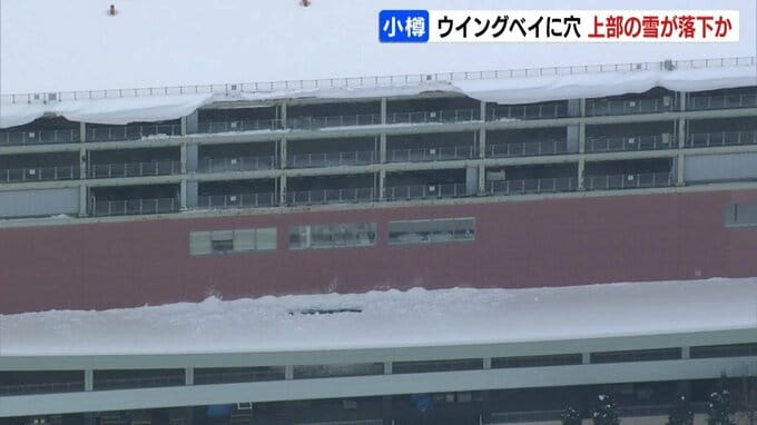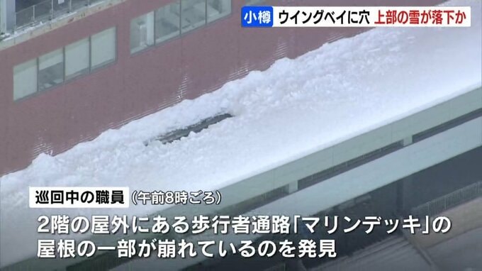 12日朝、北海道小樽市の大型商業施設「ウイングベイ小樽」で屋根の一部が崩れているのが見つかりました。上にあった雪庇(せっぴ)が落ちて穴が開いたとみられます。