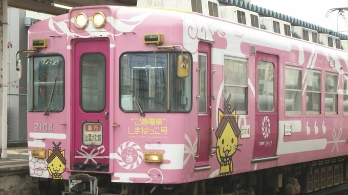 4編成全て違う色をまとった時期もあり、2104編成は2013年から19年に島根県の観光キャラクターを描いた初代の「ご縁電車しまねっこ号」として活躍。