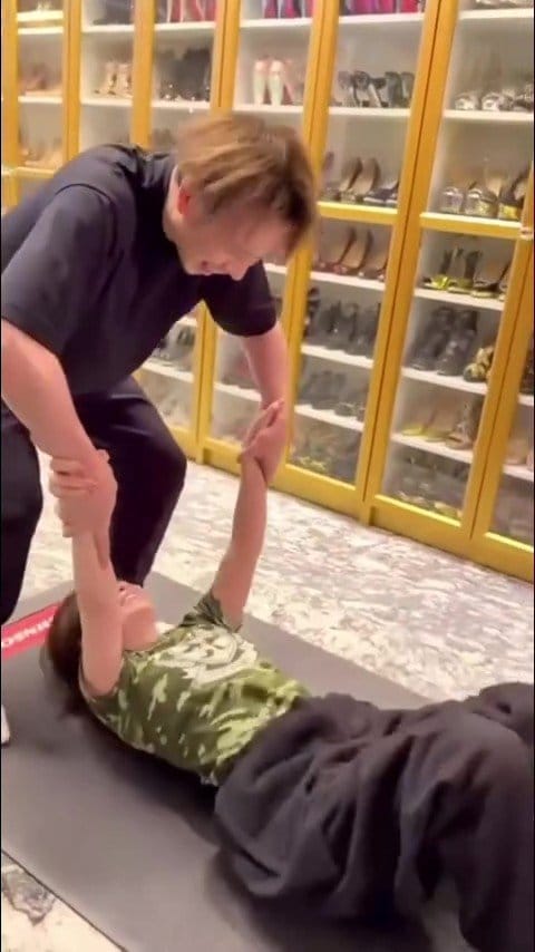 動画では、床に仰向けになった浜崎さんがスタッフの腕をしっかりと掴み、腕の力と体の動きを駆使して体を引き上げようとします。