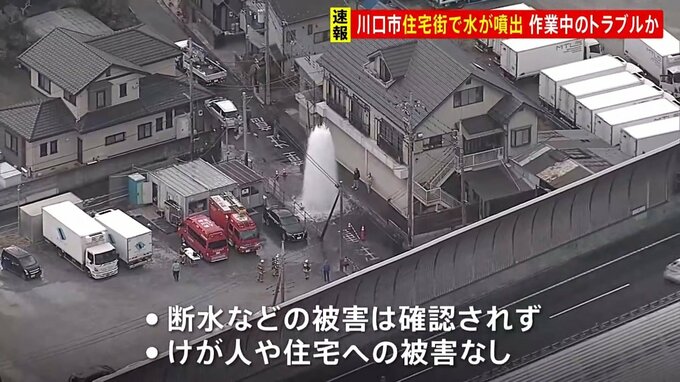 埼玉・川口市の住宅街で水が噴出 断水、けが人や住宅への被害なし 送水停止で噴出収まる TBSテレビ 2026年2月12日(木) 13:53 国内 断水などは確認されず 被害もなし 県は送水停止の作業を行い、先ほど水の噴出は収まりました。 いまのところ、断水などは確認されておらず、けが人や住宅への被害もないということです。 現場は、埼玉高速鉄道新井宿駅から北東におよそ1キロメートルの住宅街です。