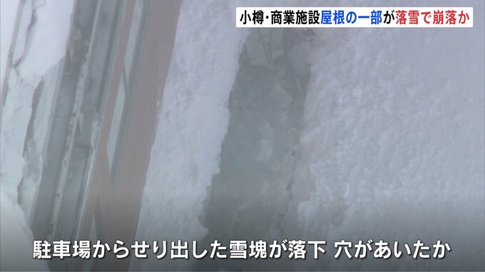 けさ、北海道小樽市の大型商業施設で、屋根の一部が崩れているのが見つかりました。上にある駐車場からせり出した雪が落ちて穴が開いたとみられます。きょう午前8時ごろ、北海道小樽市の大型商業施設「ウイングベ…