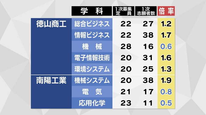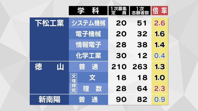 【全校掲載】山口県公立高校入試2026志願状況調査志願倍率発表 全日制はちょうど1倍 徳山・文理探究(理数)2.3倍 山口・文理探究1.4倍 【2月12日発表】 テレビ山口 2026年2月12日(木) 16:29 国内 徳山・普通は1.3倍 文理探究(理数)は2.3倍