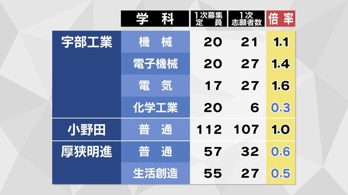 【全校掲載】山口県公立高校入試2026志願状況調査志願倍率発表 全日制はちょうど1倍 徳山・文理探究(理数)2.3倍 山口・文理探究1.4倍 【2月12日発表】 テレビ山口 2026年2月12日(木) 16:29 国内 宇部・普通は1.3倍 文理探究は0.7倍